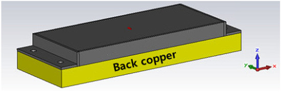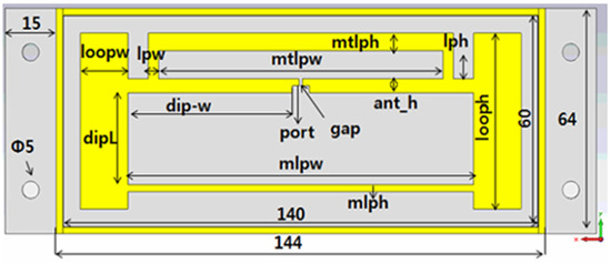 Figure 3 shows the inner shape of the convex tag antenna in yellow. The convex antenna is at 1 mm protruding with the top inner PLA cover which is called the convex area. The inner size of the cavity is 140 × 60 × 10 mm. The copper in yellow color is on four sides of the PLA plastic, and the copper on four edges allows contact with the metal to which the cavity will be attached (back copper). This copper metal helps to form the cavity structure. The concave (1 mm recessed) tag antenna has been built similarly to the convex antenna, however, the performance was not as good as that of the convex one because the liquid conductive ink clumps in the corner of the convex area of the antenna. Therefore, only the design of a convex structure is shown here.