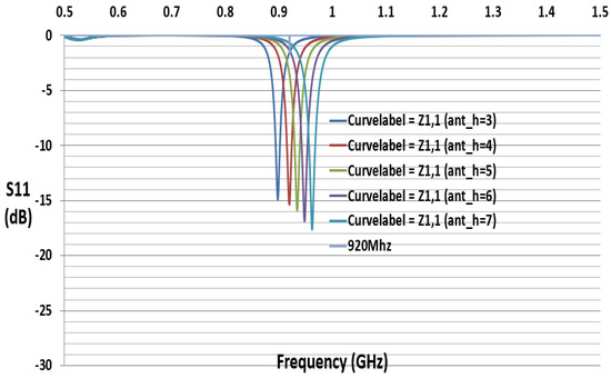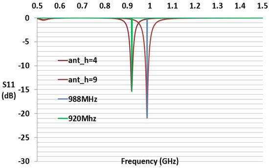 Figure 6 and Figure 7 show that the simulation S11 value of the parameter ant_h varies from 3 to 12 mm, respectively, and S11 equals −15 dB at 920 MHz and S11 equals −21 dB at 988 MHz. Figure 8 shows only the results of S11 with ant_h = 4 mm, and ant_h = 9 mm cases, to compare them clearly. The simulation antenna impedance value is calculated using this complex equation , where a is the real part and b is the imaginary value. At 920 MHz, the antenna impedance is and is the chip impedance. In the Alien Higgs-4 datasheet, and . The frequency , where f is 920 MHz. Using Equation (6), the chip impedance is at 920 MHz. The conjugate chip impedance is .