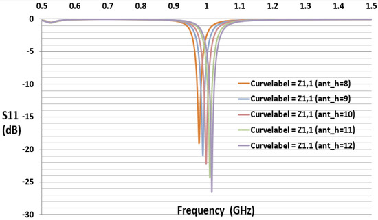 Simulated S11 results with the variation of parameter ant_h (mm).
