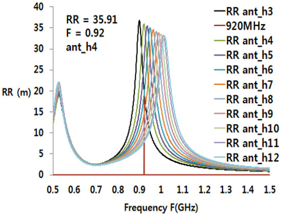 The impact of ant_h on the matching and performances is shown in Figure 9. Figure 9 shows the parametric reading range of the tag in the function of the ant_h dimension. It can be observed how the tuning of the antenna will change by increasing the loop dimension parameter ant_h. An increase in the loop dimension will decrease the resonance frequency (loop “resonance”) of the tag antenna. This means that if the ant_h increases, the loop area will decrease, and the resonating frequency increases. For ant_h equals 4, the reading range RR = 35.91 m. The reading range was calculated using the Equation (3) where τ is given by