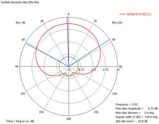 The radiation pattern of the convex RFID tag antenna is shown in Figure 10. Due to the metal cavity, at 920 MHz, the gain of the antenna is 6.73 dB, the direction of the main lobe 2.0 degree (blue line), and the 3 dB angle in the main direction is 118 degree (sky blue line).