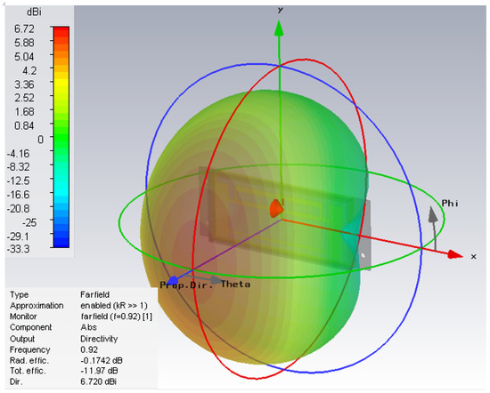 Note that , , are CST antenna simulation data. The calculation here uses antenna simulation data for ant_h = 4 mm. is the tag antenna gain. The gain is 6.73 dBi as stated in the simulation result of the gain pattern in Figure 10. The gain can be written as