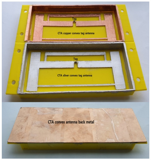 The Figure 12 shows the fabricated copper and painted silver CTA RFID tag antenna inner and back metal views for convex with ant_h equals 9, respectively. The fabricated figure for ant_h looks like Figure 1, the copper CTA, antenna, side copper, and back copper all are attached on yellow PLA plastic. For the silver CTA tag antenna, the silver paste is painted on a convex antenna shape and four sides of PLA plastic. The antenna was fabricated using copper and another SILVER COAT paste. The PLA plastic was fabricated using a 3D printer. The UHF RFID strap has been attached with the silver adhesive slow hardening solder.