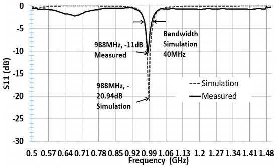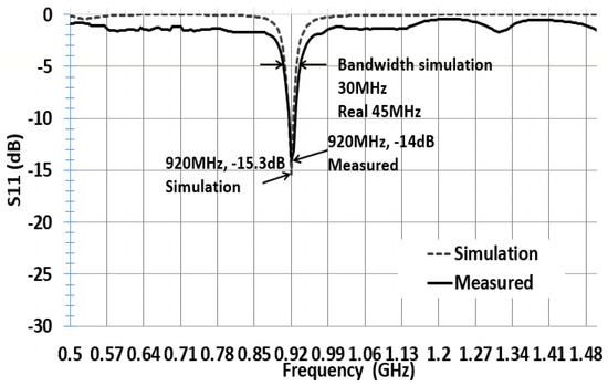 Figure 13 shows the graph of simulated and fabricated ant_h4 CTA tag antenna. The simulation reflected that coefficient S11 is −15.3 dB. After the fabrication of the antenna, we measured the reflected coefficient using Agilent’s E5071B network analyzer. The antenna presents a measured S11 of −14 dB. The bandwidth at −3 dB is 45 MHz, the frequency range is from 897.5 to 945.5 MHz, considering 920 MHz as the center frequency. This shows that our antenna can operate at both 920 and 915 MHz according to the use. Figure 14 shows the graph of the simulated and fabricated ant_h9 which resonate 988 MHz, and the simulation reflected coefficient S11 is −20.94 dB with 40 MHz bandwidth. The measured reflected coefficient S11 is −11 dB.