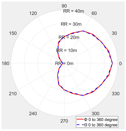 We measured the reading range with an Alien RFID reader with a linear polarized linear polarized (LP) antenna, and a circular polarized (CP) antenna. Figure 15 shows the outdoor reading range pattern of the fabricated CTA with ant_h9 size measured using CP antenna. The measurement was performed by turning the antenna according to Phi and Theta angle directions. The backside of the antenna where there is metal shows a short reading range of 1 m at 180 degrees, while the front side shows the maximum reading range of about 36 m at 0 degrees. The simulated radiation pattern also shows that the maximum power of the antenna is obtained when the convex tag antenna faces the reader.
