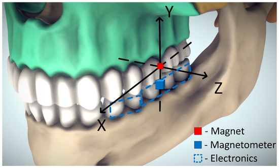 The idea of magnetic jaw position tracking is illustrated in Figure 1. It is based on the fact that the magnetic field around a magnetic dipole can be precisely calculated, and every spatial point around it has a unique, non-recurring magnetic field vector [8]. If orientations of a magnet and a 3-axial magnetometer are known, the magnetic field can be used to determine displacement between them. A strong advantage of this method is that no electrical connection between maxilla and mandible is needed. The permanent magnet would be attached to the teeth in the maxilla, and a magnetometer with supporting electronics would be attached to the teeth in the mandible (Figure 1); a vice-versa layout is equally possible.