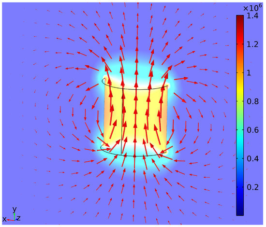 Finite element model of a cylindrical dipole’s magnetic field. Color: magnetic density norm (T). Arrow (logarithmic): flux density.