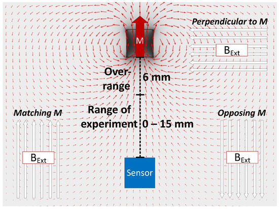 The effects of constant BMF had to be assessed before any positioning experiments. Since the principle of superposition is valid for magnetic fields, all measured values include components of the Earth’s magnetic field. Local BMF values, acquired during the pretest, were subtracted from the measured values. They were replaced by adding theoretical values equal to BMF, of constant size and direction. Three separate simulations were done, with BMF direction matching, opposing and being perpendicular to the magnetic moment of the magnet. Depending on location, Earth’s surface magnetic field is in the range of 25–65 T [11]. Therefore, maximum value of T was used. The errors induced by BMF of various directions were calculated at different magnet-sensor distances of 15 mm range. Experiments were made on one axis, while other axis’ positions were held at 0. The scheme of the experiment is presented in Figure 3.