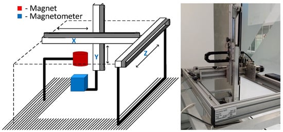 Main and reference magnetic field measurements were done using MPU-9250 (TDK InvenSense, San Jose, CA, USA) 9 degrees-of-freedom (DOF) IMU’s containing 3-axial digital magnetometers with dynamic range of ±4912 T. The dimensions of the whole system on a chip were 3 × 3 mm. The sensors were controlled by the nRF52 Development kit (Nordic Semiconductor, Oslo, Norway). The sensors were calibrated, axially aligned and placed at 35 mm distance from each other. Experiments were performed using a 3D positioning system EMS 301 (Elintos Matavimo Sistemos, Kaunas, Lithuania) with 0.1 mm step positioning resolution, controlled via Matlab. The magnet was mounted in a fixed position, while the sensor was moved by the positioning system. The setup of the experiment is presented in Figure 4.
