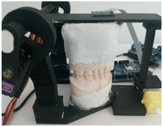 A single-hinge vertical articulator was built to simulate vertical jaw motion, and MPU9250-9 DOF IMU containing 3-axial accelerometer was fastened to the moving part. Gypsum teeth were brought to mild contact in 50% of the motion cycles in order to evaluate the performance of the developed algorithm. The setup of the vertical motion articulator experiment is presented in Figure 5. To maximize the mechanical contact, the flat top surface of the articulator was chosen for sensor fixation, and cyanoacrylate glue was used for bonding.