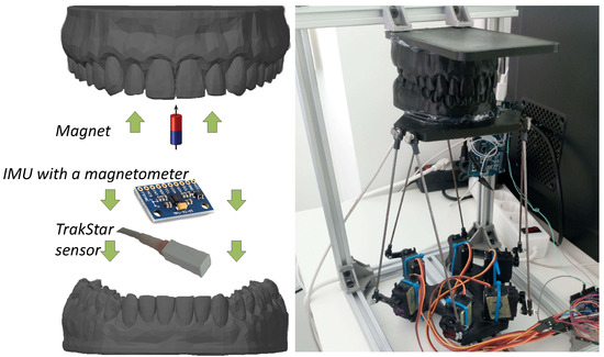 A 6 DOF servo motor driven Stewart platform was built to test the teeth impact detection together with magnetic position tracking, by simulating a masticatory trajectory at a natural speed. The same masticatory curve was used as in position tracking experiment, but due to the unsteadiness of the custom-made, economy-class Stewart platform, the curve was distorted, and each iteration was reproduced slightly differently. Therefore, for a reference position, the electromagnetic tracking system “3D Guidance trakSTAR” (Ascension Technology Corporation, Shelburne, VT, USA) was used. The system works with alternating electromagnetic fields in low radio frequency range, and it neither affects the permanent magnet position measurement nor is affected by it. Data from all sensors were recorded with time-stamps and processed after the experiment, not in real-time. Since the goal of this test is to demonstrate the possibilities of the system, the threshold for impact detection was chosen experimentally, to work on the signals in this specific setup. Models of teeth were 3D-printed from polylactide (PLA). The sensors were fixed onto the mandible with hot glue, and the magnet was fixed to the maxilla with cyanoacrylate glue. The setup of the general system test using the Stewart platform is presented in Figure 6.
