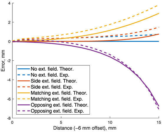 Errors that would be induced by the 65 T background magnetic field (BMF) were calculated and presented in Figure 7. By adding values equal to BMF, to both theoretical and experimental data, BMF was simulated in three directions. The graph shows that in close range, the effects of BMF were close to zero. However, BMF had a large influence at 10 mm distance from starting point due to inverse cube law attenuation of the magnetic field. That means increased errors with an open jaw. From a practical point of view, at 10 mm distance from occlusion, teeth are definitely not in contact, so perfect precision is not crucial. Nevertheless, errors of this magnitude significantly decreased the dynamic range of the system. This confirms a need for an active BMF compensation.