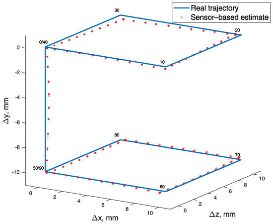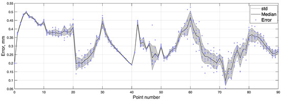 The position tracking experiments were executed using a 3D positioning system shown in Figure 4. The coordinates of the cubic test trajectory were determined 10 times, resulting in an average RMSE and standard deviation equal to mm. BMF was compensated using a reference magnetometer. Measured points are numbered 0 to 90, and all 10 iterations are represented in transparent markers in Figure 9. To show the error and reproducibility of 10 iterations, the median and standard deviation for each point are presented in Figure 10, with points showing errors of each measurement.