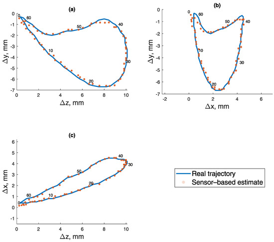 In the experiments, the approach of automatic position and motion simulations was chosen, aiming to prove the effectiveness of proposed method. It was concluded early in the study that the method is susceptible to BMF’s and has subsequent limitations in precision and dynamic range. To address this problem, a reference magnetometer for BMF compensation was used. On the basis of the magnet’s strength-to-distance dependency seen in Figure 8, it was substantiated that the minimum distance of 35 mm would be sufficient for reference BMF measurements to remain unaffected by a permanent magnet’s field. A reference magnetometer located on the opposite side (of the dental arch) from the main sensor was chosen as a remedy for BMF influence. However, this solution has a drawback of increasing the size of the device. With reference BMF correction, the average 10 measurement RMSE and standard deviation was mm for a cubic trajectory (a = 10 mm). With a natural masticatory trajectory (10 × 7 × 5 mm), the 10 measurement average RMSE and standard deviation was mm. The algorithm still managed to calculate sensor position within <1 mm error at 18 mm distance from occlusion, but the optimal working range recommended by the authors is in 15 mm radius from zero position (occlusion). Such range and error level should be sufficient to determine jaw trajectories and thus to distinguish types of masticatory activity. However, signal processing solutions preventing position errors in wide-open jaw cases should be considered. For instance, Kalman filter could be used to maintain consistency in position measurements. This method would allow visualization of continuous jaw movement in 3D models and could enable new research of parafunctional jaw activities.