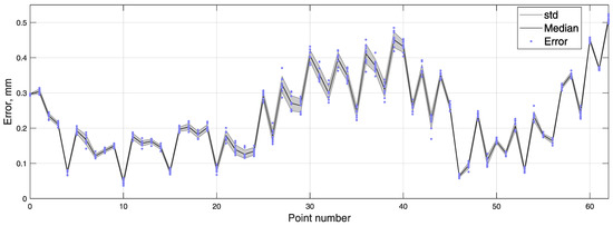 The coordinates of masticatory test trajectory were determined 10 times, resulting in an average RMSE and standard deviation equal to mm. BMF was compensated using a reference magnetometer. Measured points are numbered 0 to 62, and all 10 iterations are represented in transparent markers in Figure 11. To show error and reproducibility of 10 iterations, the median and standard deviation for each point are presented in Figure 12, with points showing errors of each measurement.
