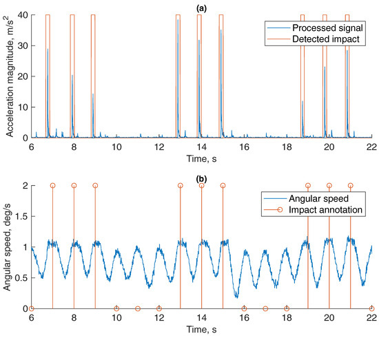 Impact detection in vertical movement. (a) Processed accelerometer signal and (b) a reference signal of angular velocity with impact annotation.