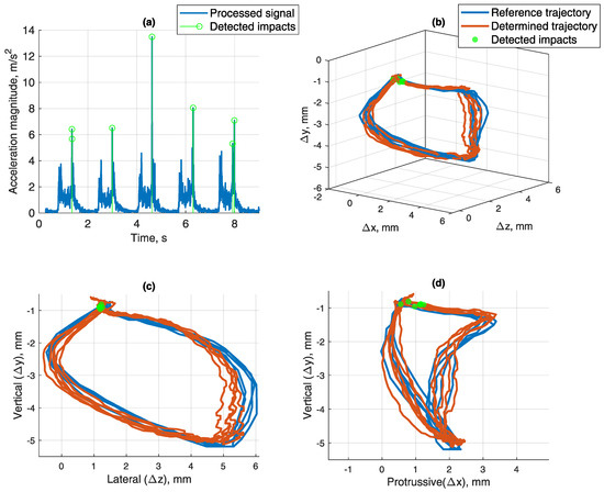 (a) Teeth impact detected by an experimentally selected threshold of 5 m/s, set on acceleration vector’s magnitude value (RSS of X, Y and Z components). (b) Masticatory trajectory determined by magnetic position tracking and reference methods, while detected teeth impacts are marked at the points of detection. 3D view. (c) Lateral–vertical view (z-y). (d) Protrussive–vertical view (x-y).