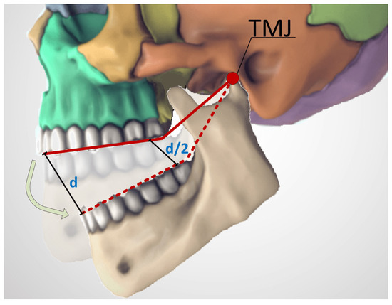 Path difference for sensors mounted at different distances from the temporomandibular joint. For a system with limited dynamic range, a shorter path would allow to record wider jaw movements. Adapted from [9].