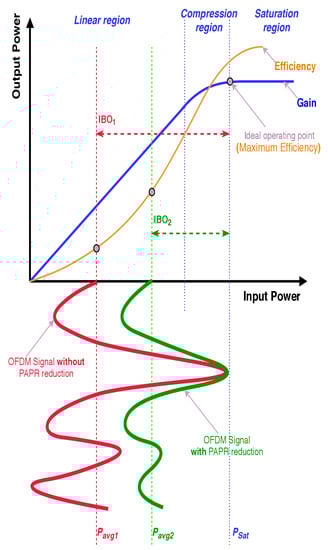 This section emphasizes the importance of PAPR reduction. Because HPA is the primary source of nonlinear distortion in OFDM-based systems, an adequate HPA model must be considered. Different models exist for memoryless HPAs, such as Rapp model, Ghorbani model, and Saleh model []. Generally, AM/AM characteristics of any memoryless HPA have three regions, namely linear region, compression region, and saturation region, as illustrated in Figure 1. Nonlinear distortion severity relies on the value of the input back-off (IBO), which is given by [];
