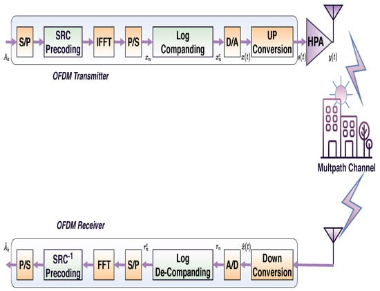 The authors in [,] showed that SRC precoding (Section 3.1) and Log companding (Section 3.2) are the best precoding and the best companding techniques from BER and OOB-radiation reduction points of view. Therefore, they are selected to be hybridized in the proposed technique, and their parameters are adjusted to increase the reduction of BER and OOB-radiation. Figure 2 shows the block diagram of the proposed model. The model considers HPA into account, Rayleigh and AWGN channels are simulated. In contrast, most of the previous works neglect HPA and simulate only the AWGN channel. However, OFDM was designed originally for Rayleigh channels, and PAPR reduction techniques are used to mitigate the nonlinear distortion of HPA.