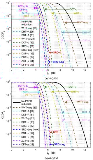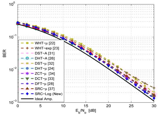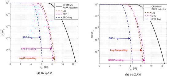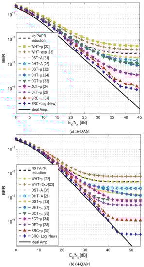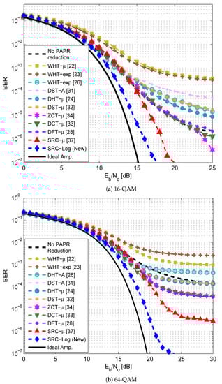 Figure 6 shows the comparison results of the PAPR reduction capability of SRC-Log with the ten state of the art precoding-companding techniques (i.e., DHT-A [], SRC- [], DCT- [], DFT- [], DST- [], DHT- [], WHT- [], WHT- [], DST-A [], and ZCT- []). As shown in Figure 6a,b, in 16-QAM and 64-QAM PAPR reduction performance is almost similar. Clearly, in 16-QAM and 64-QAM DHT-, DST-, and WHT- are better than DHT-A, DST-A, and WHT-. This is because -law companding has PAPR reduction performance better than A-law companding and  companding []. Not surprisingly, ZCT-, DFT-, DHT-, and DST- have PAPR reduction performance better than SRC-Log. As, -law companding has PAPR reduction performance better than Log companding, especially at low PAPR values. However, at high PAPR values, Log becomes hardly better than -law. Although ZCT-, DFT-, DHT-, and DST- have PAPR reduction performance better than SRC-Log, this does not mean they are better than SRC-Log because PAPR reduction performance is not the primary metric to determine the best technique. Especially when working with the techniques that cause BER degradation as a PAPR reduction cost, such as companding techniques.