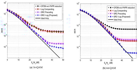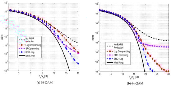 It is observed in 16-QAM (Figure 4a and Figure 5a) that SRC precoding has better BER performance than Log companding, while in 64-QAM (Figure 4b and Figure 5b) SRC precoding has worse BER performance than Log companding. This is because precoding techniques have PAPR reduction performance depends on modulation order. This can be observed in Figure 3, where SRC precoding has better PAPR reduction performance than Log companding in 16-QAM (Figure 3a) and worse than in 64-QAM (Figure 3b).