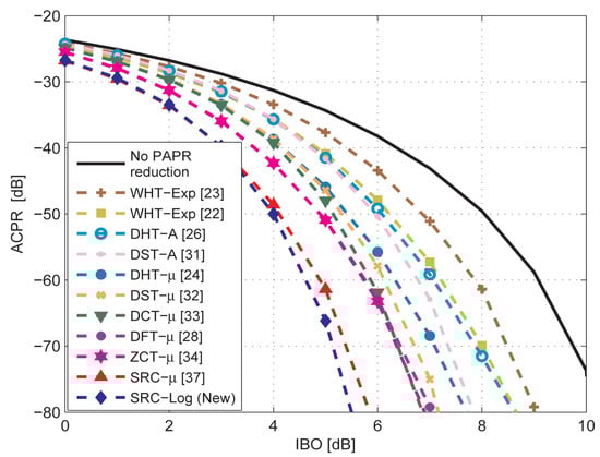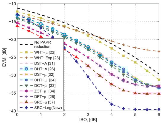 Also, the SRC precoding outperforms all other techniques []. Hence, hybrid SRC-Log can better reduce the BER and OOB radiation than the previous precoding-companding techniques. The proposed SRC-Log is compared with the ten state of the art precoding-companding techniques (i.e., DHT-A [], SRC- [], DCT- [], DFT- [], DST- [], DHT- [], WHT- [], WHT- [], DST-A [], and ZCT- []) in the presence of HPA from PAPR reduction gain, OOB radiation, Error Vector Magnitude (EVM), and BER points of view.