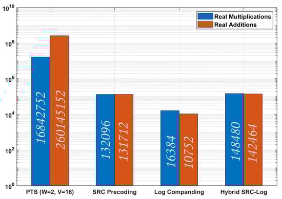 Comparison of computational complexity of SRC, Log, and Hybrid SRC-Log, based on (17), (19), along with PTS [] with V = 16 and W = 2.