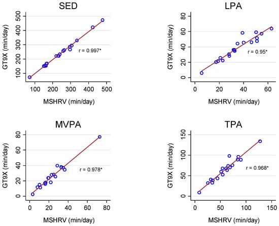 Pearson Correlations (r) for sedentary behavior and physical activity (PA) estimates between the GT9X and MotionSense HRV (MSHRV) under free-living conditions. SED: sedentary behavior; LPA: light PA; MVPA: moderate-to-vigorous PA; TPA: total PA; * p < 0.05.