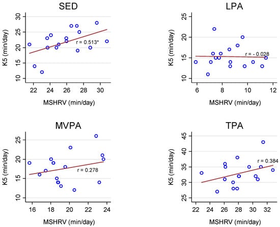 Pearson Correlations (r) for sedentary behavior and physical activity (PA) estimates between the Cosmed K5 (K5) and MotionSense HRV (MSHRV) under simulated free-living conditions. SED: sedentary behavior; LPA: light PA; MVPA: moderate-to-vigorous PA; TPA: total PA; * p < 0.05.