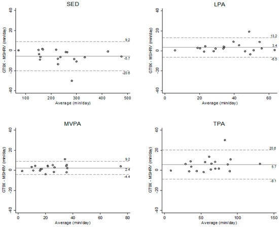Bland–Altman plots illustrating the level of agreement in sedentary behavior and PA estimates between the GT9X and MotionSense HRV (MSHRV) under free-living conditions. Dashed lines show 95% limits of agreement (±1.96 standard deviation). SED: sedentary behavior; LPA: light PA; MVPA: moderate-to-vigorous PA; TPA: total PA.