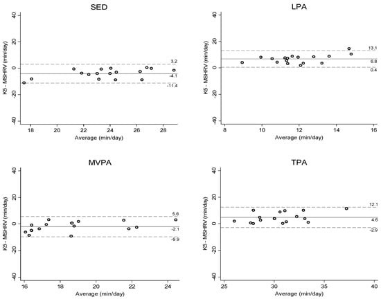 Bland–Altman plots illustrating the level of agreement in sedentary behavior and PA estimates between the Cosmed K5 and MotionSense HRV (MSHRV) under simulated free-living conditions. Dashed lines show 95% limits of agreement (±1.96 standard deviation). SED: sedentary behavior; LPA: light PA; MVPA: moderate-to-vigorous PA; TPA: total PA.