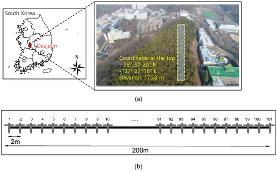 The experimental area of this study was a mountain with a history of landslides, located in Daejeon Metropolitan City, South Korea, and reinforcement techniques, including anchor and bolt, used for retaining walls and rockfall prevention networks were applied. The objective area was located near the downtown area, as depicted in Figure 1; hence, significant damage may be accompanied by landslides. The objective area was continuously monitored after the reinforcement technique was applied to analyze the behavior of the area and prevent landslide occurrence. The coordinates at the top of the mountain are 36° 20′ 20″ N and 127° 27′ 16″ E, and the elevation is approximately 175.8 m.