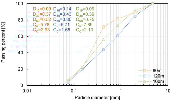 The soil samples were collected at positions of 80 m, 120 m, and 160 m in the horizontal direction, and sieve analysis was performed to determine the characterization of the slope. The fine contents of 80 m, 120 m, and 160 m were calculated to be 3.9%, 3.9%, and 3.8%, respectively, as shown in Figure 2. The coefficients of uniformity (Cu) were estimated to 5.78, 5.71, and 7.89 for each position, and the coefficients of curvature (Cc) of 2.93, 1.65, 2.13 were deduced at positions of 80 m, 120 m, and 160 m, respectively. Finally, the study area was distributed with poor-graded sand (SP) through the unified soil classification system (USCS).