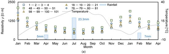 The electrical resistivity values measured over 15 months using each of the four electrodes are displayed in Figure 3, which indicates that the distributions of electrical resistivity were based on electrode spacings of 1, 4, 7, 10, 13, 16, 19, and 21. The electrodes were installed at 2 m intervals. For example, electrode spacings of 1 and 21 denote 2 and 42 m intervals of the electrodes, respectively. Temperature and rainfall values were also recorded and plotted, as shown in Figure 3.
