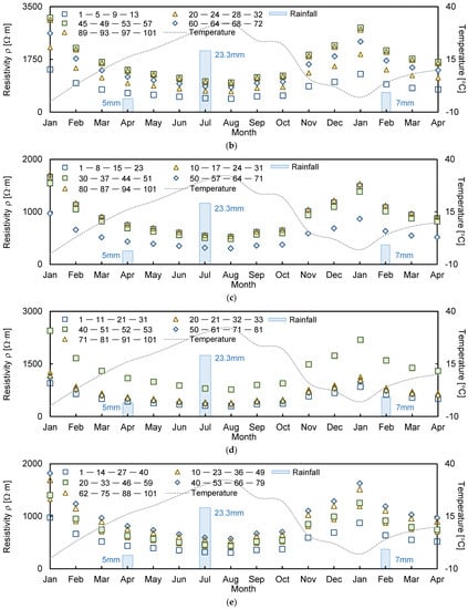 During the measurement period, 5 and 23.3 mm of rainfall fell in April and July of 2019, respectively. The electrical resistivity results obtained in March and June, which were the respective preceding months of rainfall, were compared to analyze the electrical resistivity behavior with respect to the rainfall. When the rainfall was 5 mm (April), the electrical resistivity decreased to 34.17%, 31.93%, 27.96%, 24.26%, 23.22%, 22.99%, 21.10%, and 9.17% for electrode spacings of 1, 4, 7, 10, 13, 16, 19, and 21, respectively. The electrical resistivity measured in July also decreased to 35.48%, 34.20%, 30.43%, 26.71%, 25.71%, 23.70%, 21.18%, and 17.96% with an increase in electrode spacing. This behavior is similar to that shown in previous research findings, in which the electrical resistivity decreased with an increase in ground moisture [32]. Furthermore, the electrical resistivity varied slowly with temperature and rainfall when the electrode spacing was increased because the deeper the depth, the slower the reaction to external environmental changes.