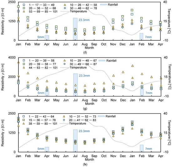 In this study, the electrical resistivity was measured for 15 months, from January 2019 to April 2020. Even though the values were measured on the 1st day and 15th day of each month, the electrical resistivity was also recorded in particular cases, including rainfall and temperature change. The number of measured data points at a given time was 1650, and a total of 49,500 (1650 × 15 months × 2 times) measurements were performed.