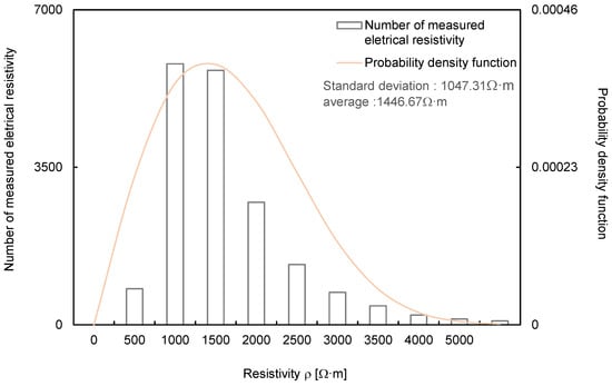 The measured electrical resistivity values ranged from 1 to 3700 Ω·m at different locations and depths. The distribution curve of electrical resistivity is presented in Figure 4. The average value of the measured electrical resistivity was 1446.67 Ω·m, and the standard deviation was 1047.31 Ω·m. The reliability of the deep learning algorithms was compared using the reliable electrical resistivity values measured over the 16 months.