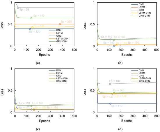 During the model building stage, the DNN, LSTM, GRU, LSTM-DNN, and GRU-DNN deep learning algorithms were selected, and the activation function, initialization method, number of hidden layers, number of nodes, optimization technique, iterative method, and sequence length were set. Six commonly used activation functions—hyperbolic tangent (tanh), sigmoid, softplus, rectified linear unit (relu), exponential linear unit (elu), and scaled exponential linear unit (selu) [33,34] were selected to compare the reliability of the algorithms. The initialization method was classified based on the applied activation function. In the cases of the tanh, sigmoid, and softplus functions, the Xaviera normal initialization method was used [35], while the He initialization method was applied to the relu, elu, and selu functions [36]. In this study, an appropriate initial weighting method was adopted according to the six selected activation functions. The number of hidden layers was set to 2, 10, and 20 layers in each of the algorithms. The numbers of nodes in the DNN algorithm were 20, 30, and 40, and the sequence lengths of LSTM and GRU were set to 1, 10, and 20. In addition, the number of nodes and the sequence lengths of the LSTM-DNN and GRU-DNN algorithms were identically configured based on the individual algorithm conditions. The optimization technique is an important method used for determining the weight and bias of each algorithm. The Adam optimizer, which combines the advantages of Adagrad [37] and RMSProp [38], was used. Finally, the early stopping technique was used as the iterative method to prevent overfitting.