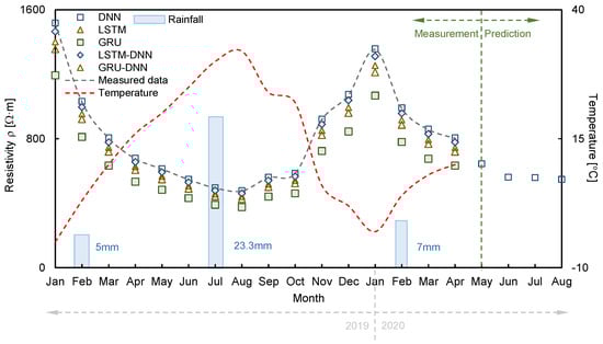 Deep learning algorithms have been used in various fields to predict the future behaviors of objects. In this study, the DNN, LSTM, GRU, LSTM-DNN, and GRU-DNN deep learning algorithms were applied to predict electrical resistivity, which indicates the behaviors of geotechnical engineering. The detailed conclusions of this study are as follows: