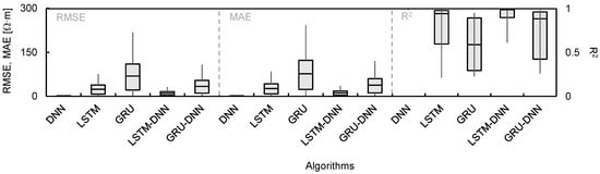 The RMSE, MAE, and R2 were calculated using Equations (10)–(12) to evaluate the reliability of the hyperparameters set in each algorithm. A reverse min–max scaling method was applied to obtain the electrical resistivity because the predicted values using the deep learning algorithms were normalized. In Figure 6, each hyperparameter was divided into groups depending on the deep learning algorithms for DNN (activation function, number of hidden layers, and number of nodes) and both LSTM and GRU (activation function, number of hidden layers, and sequence length). LSTM-DNN and GRU-DNN were combined with the activation function, number of hidden layers, number of nodes, and sequence length for comparison with the calculated error. DNN, LSTM, and GRU were marked as 56 types, and LSTM-DNN and GRU-DNN were classified as 162 cases. The calculated RMSE, MAE, and R2 are summarized in Table 2. The hyperparameters in which the RMSE and MAE values were minimum and R2 was maximum were DNN (Relu, 10, 30), LSTM (tanh, 2, 1), GRU (tanh, 2, 1), LSTM-DNN (tanh, 10, 20, 1), and GRU-DNN (tanh, 10, 20, 1). These conditions were considered the most reliable hyperparameters and are listed in Table 3. The RMSE, MAE, and R2 were evaluated using DNN (36.38 Ω·m, 22.62 Ω·m, 0.99), LSTM (209.12 Ω·m, 155.47 Ω·m, 0.42), GRU (415.56 Ω·m, 414.59 Ω·m, 0.08), LSTM-DNN (160.71 Ω·m, 80.98 Ω·m, 0.69), and GRU-DNN (375.25 Ω·m, 306.05 Ω·m, 0.09), as shown in Figure 6. Hence, the order of the optimal deep learning algorithms for predicting electrical resistivity under these experimental conditions was found to be DNN > LSTM-DNN > LSTM > GRU-DNN > GRU. However, even though LSTM-DNN was the second most reliable algorithm after DNN, the difference in the error values between these two algorithms was large. It should be noted that DNN adequately reflected the trend in the measurement data. A pattern analysis of electrical resistivity was conducted by comparing the measured values with the predicted values based on the hyperparameters with high reliability, and the results of each deep learning algorithm are displayed in Figure 7. The 3300 data measured each month were averaged and plotted to represent each month. Among the deep learning algorithms, DNN showed the most similar trends and values to the measured data (Figure 7). However, the values predicted using the other algorithms had a low electrical resistivity range, which resulted in insufficient reliability. Discrepancies were calculated using Equations (10)–(12) to quantitatively analyze the accuracy of each algorithm, as shown in Figure 8. The averaged RMSE, MAE, and R2 groupings of the DNN, LSTM, GRU, LSTM-DNN, and GRU-DNN algorithms were (2.96 Ω·m, 3.29 Ω·m, 0.98), (60.82 Ω·m, 67.58 Ω·m, 0.77), (175.33 Ω·m, 194.81 Ω·m, 0.59), (25.80 Ω·m, 28.66 Ω·m, 0.92), and (86.38 Ω·m, 95.98 Ω·m, 0.73), respectively. DNN exhibited greater reliability than the other deep learning algorithms based on quantitative values. The DNN algorithm clearly enhances the reliable prediction of electrical resistivity by reflecting the changes in external environmental conditions, including rainfall and temperature.