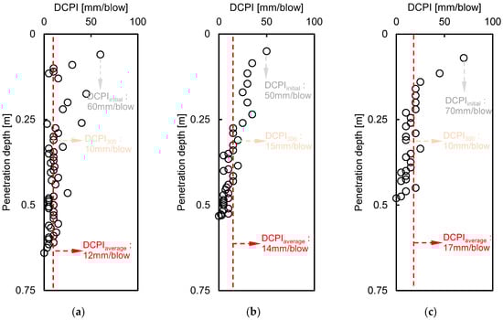 Results of dynamic cone penetrometer index (DCPI) through a dynamic cone penetrometer test (DCPT) at horizontal positions of (a) 80 m; (b) 120 m; (c) 160 m.