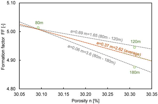 Relationship between the formation factor and porosity for the extracted specimens. Here, a and m denote the tortuosity and cementation factors.