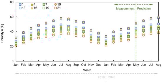 Thus, the distributions of porosity showed similar behavior to the trend of electrical resistivity. Although the types of pores, specific surface areas, tortuosity, and overburden pressure may change when rainfall or external conditions occur, there is a limit to evaluating the detailed behaviors reflecting seasonal variation. Therefore, porosity distributions were presented, focusing on the overall behavior.