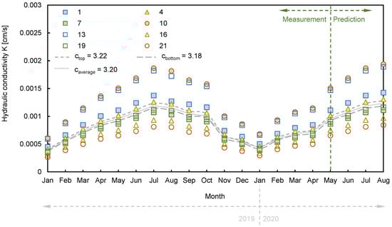 Hydraulic conductivity was converted using the measured electrical resistivity and Equation (4). For the shape factor, an average value of 8.4 was used [40], and the average effective diameter of 0.59 mm was applied, with reference to the result of the sieve analysis, as shown in Figure 2. Thus, the specific surface area per unit volume (Sp), which is the ratio between the shape factor and the effective diameter, was calculated as 14.23 (mm−1). The value of c was derived as another constant by inverting the measured hydraulic conductivity from the constant head test. The specimens were extracted at the top and bottom of the slope, and the hydraulic conductivity levels were measured as 0.0005 cm/s and 0.00049 cm/s, respectively. Finally, the c values were calculated as 3.22 and 3.18 at the top and bottom of the slope, and an average value of 3.2 was used to find the distributions of hydraulic conductivity, as shown in Figure 12. From January 2019 to April 2020, which was the range of measured electrical resistivity, hydraulic conductivity was repeatedly increased and decreased by about 0.00027–0.00194 cm/s. In addition, hydraulic conductivity tended to increase slightly after May 2020, and the predicted hydraulic conductivities were observed in the range from 0.00045 cm/s to 0.00143 cm/s. The hydraulic conductivity also had a strong influence on electrical resistivity when the constant value was fixed. Thus, the distribution of hydraulic conductivity was similar to the trend of electrical resistivity. Although it was difficult to capture the detailed input constant according to monthly strata changes, it was possible to determine the overall behavior of hydraulic conductivity.