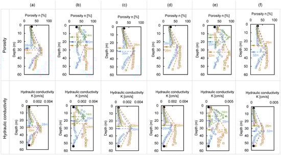 Discontinuity depth assessment based on porosity and hydraulic conductivity: (a) February 2019; (b) July 2019; (c) May 2020; (d) June 2020; (e) July 2020; (f) August 2020. The blue circles, red rectangles, and green triangles denote 80 m, 120 m, and 160 m horizontal distance, respectively, and each symbol is connected with a dotted straight line. The solid circles with black color indicate the measured values.