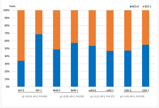 MY 0—milk yield ≤ 31 kg/day; MY 1—milk yield > 31 kg/day; BHB 0—β-hydroxybutyrate in milk—≤ 0.06 mmol/L; BHB 1—β-hydroxybutyrate in milk > 0.06 mmol/L; LDH 0—milk lactate dehydrogenase ≤ 27 μmol/min; LDH 1—milk lactate dehydrogenase > 27 μmol/min; mP4 0—milk progesterone ≤ 15.5 ng/mL; mP4 1—milk progesterone > 15.5 ng/mL; BCS 0—body condition score ≤ 3.2 points; BCS 1 > 3.2 points.
