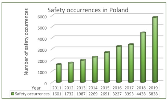 - Civil Aviation Authority of the Republic of Poland. Safety Report on Civil Aviation Safety Status in 2019 (Pol. Sprawozdanie o Stanie Bezpieczeństwa Lotnictwa Cywilnego za Rok 2019); Issue 2020; Civil Aviation Authority of the Republic of Poland: Warsaw, Poland, 2020. Available online: https://www.ulc.gov.pl/pl/zarzadzanie-bezpieczenstwem/analizy-bezpieczenstwa/5336-sprawozdanie-o-stanie-bezpieczenstwa-lotnictwa-cywilnego-za-rok-2020 (accessed on 2 January 2021).