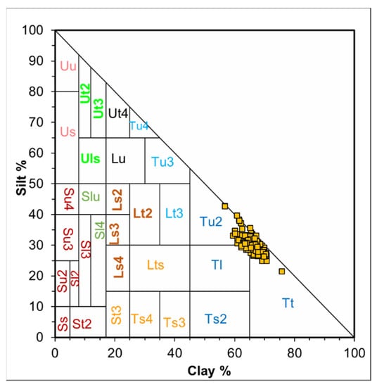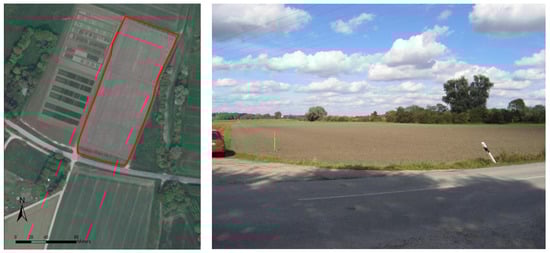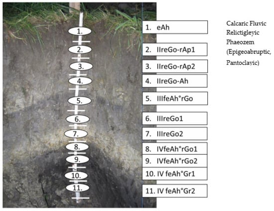 The average annual temperature in the area is approximately 7.8 °C, and the average annual precipitation is 800 mm. Holocene sediments are the predominant soil material. The composition of this flat area is a consequence of repeated floods with periods of soil-forming processes. According to the German Soil Survey [] and the WRB, Calcaric Fluvic Relictigleyic Phaeozem is the dominant soil type (see Figure 1, Figure 2 and Figure 3). The soil texture of the field is Tl [] with loamy clay. The mean clay content is about 65%, with 1% sand. The fine and middle fractions are the dominant texture classes of silt in the area (Table 2).