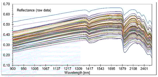 The same figure shows that the spectral reflectance increased gradually with wavelengths from 900–1400 nm. The reflectance reached its first reflection peak between 1390 and 1400 nm. Three more significant reflection peaks appeared at 1450, 1860, and 2120 nm. The two reflection peaks at 1420 and 1930 nm were also characteristic of soil curves. The reflection curves were affected by color, particle size, moisture, and mineral composition (especially the presence of iron). The soil reflectance curves in the NIR region for different soil types, along with the most critical parts for water and carbon and their responsible chemical groups, are shown in Vasques et al. [,].